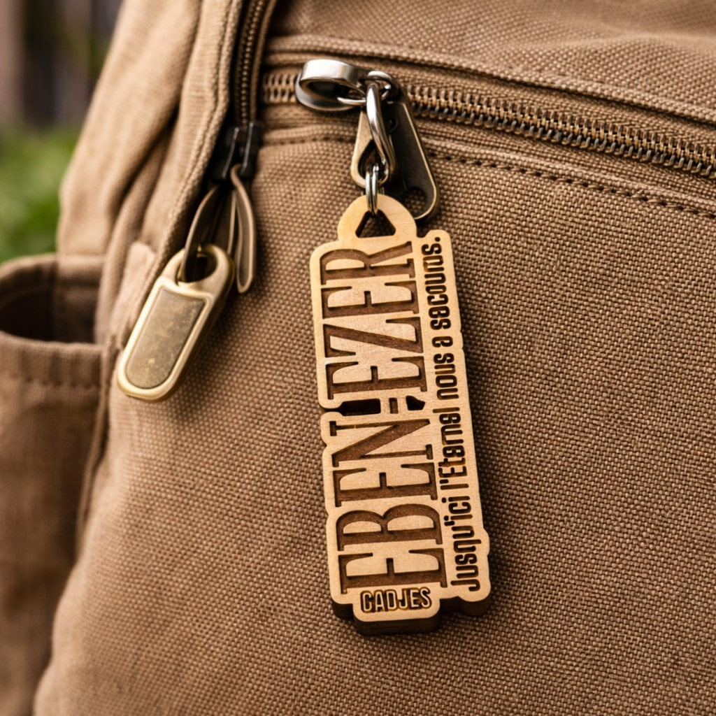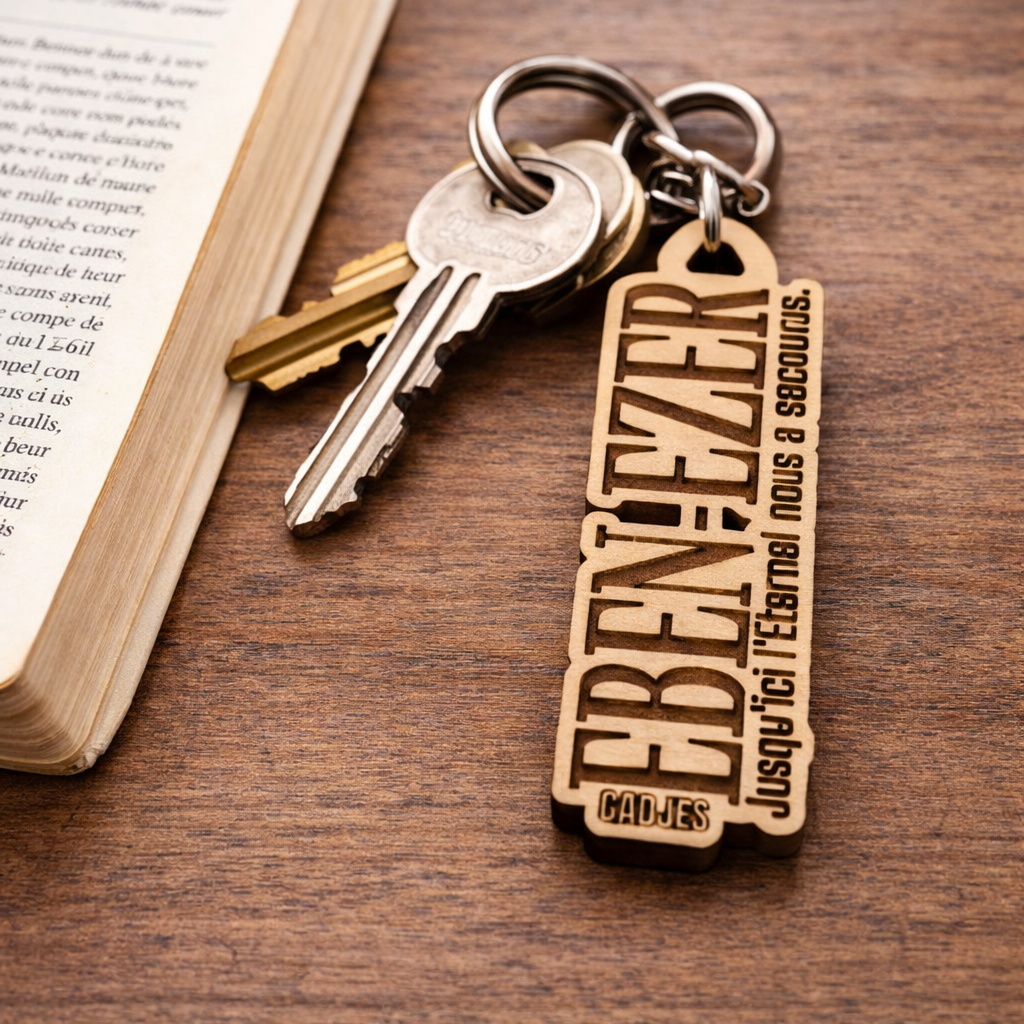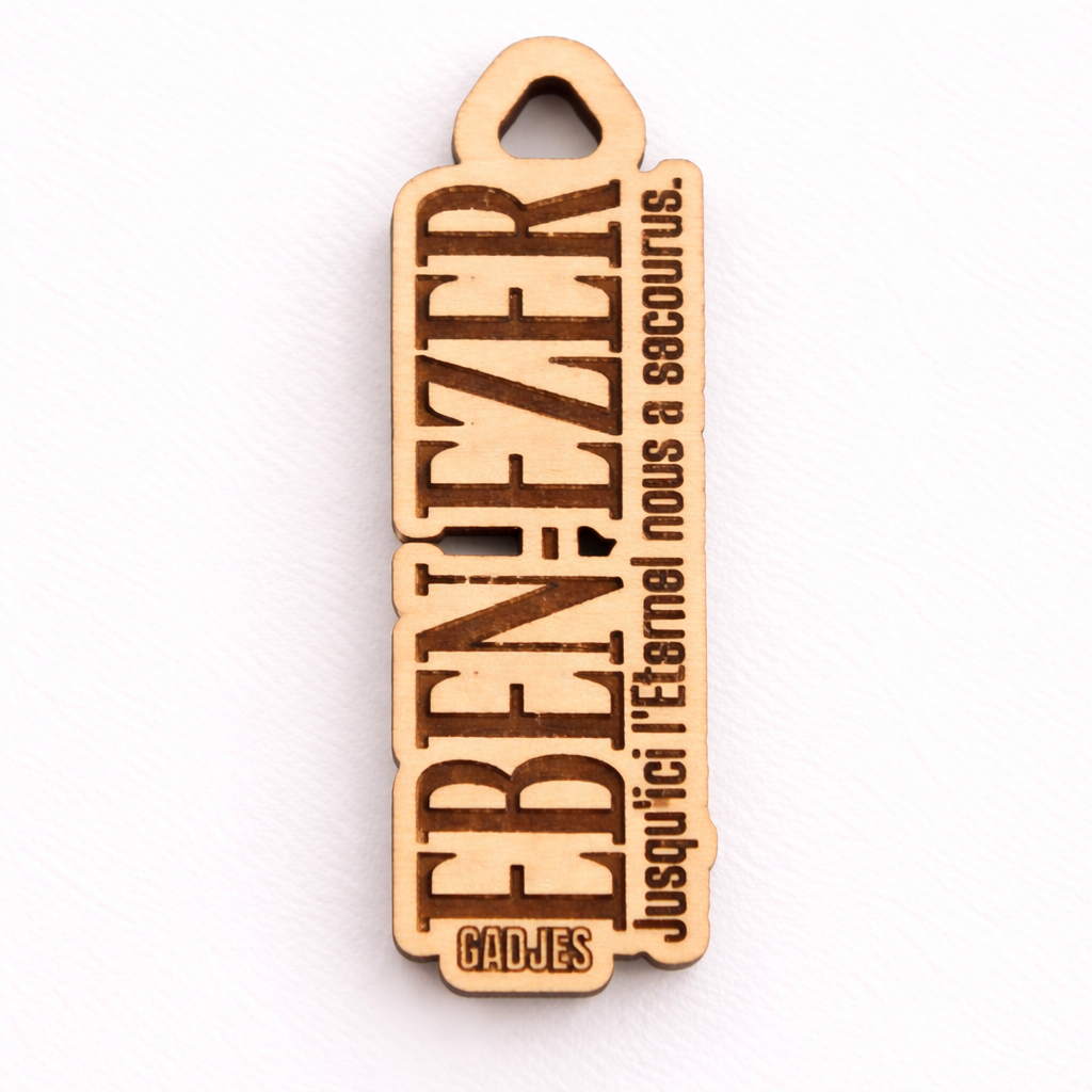 Le PASSE-MESSAGE EBEN-EZER est un accessoire d’accroche en bois naturel, gravé avec soin, portant une déclaration biblique forte : “Jusqu’ici l’Éternel nous a secourus.”