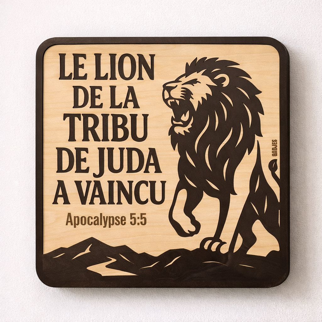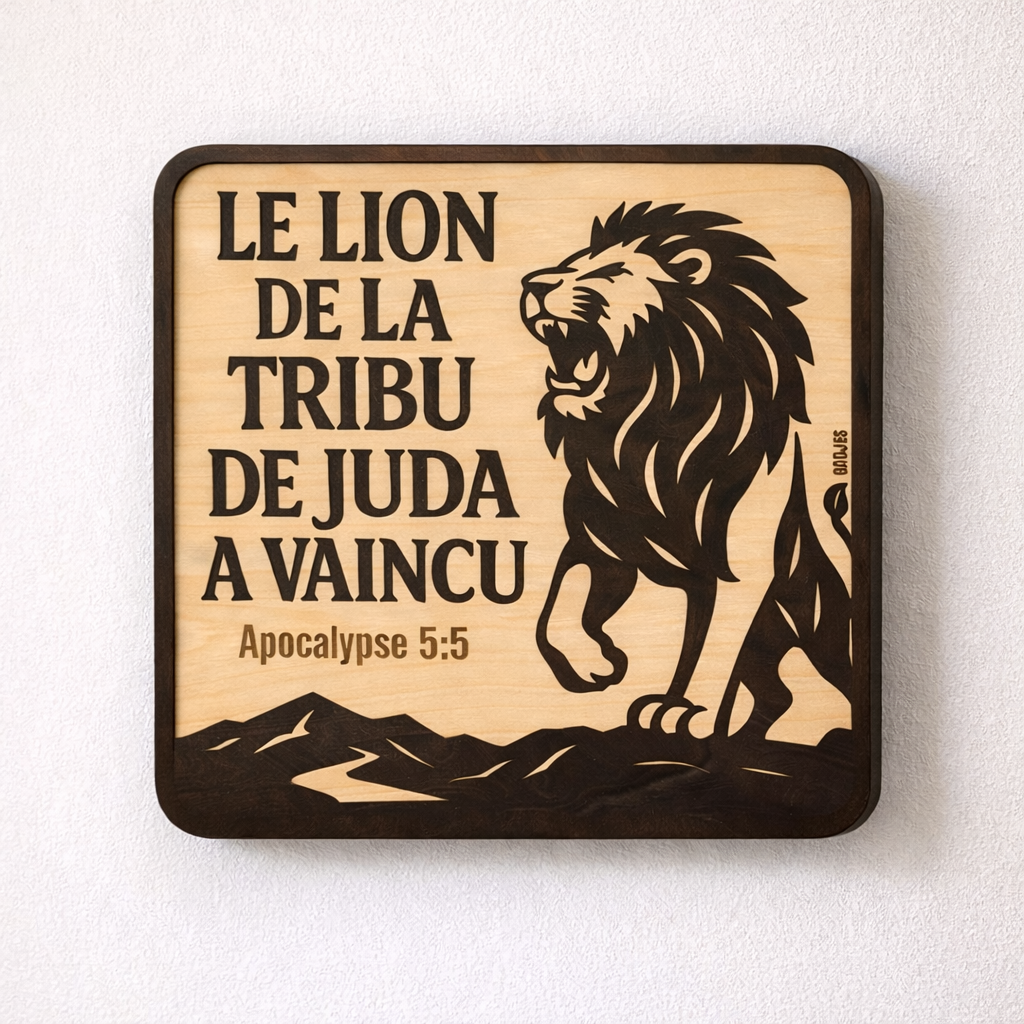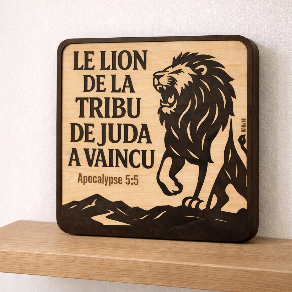 Imaginez entrer dans une pièce et votre regard est immédiatement attiré par cette œuvre sobre et puissante. Ce n’est pas qu’un simple tableau mural en bois ; c’est une affirmation silencieuse, gravée dans le grain naturel du chêne. Il porte en lui les mots d’Apocalypse 5:5 : « Le Lion de la tribu de Juda a vaincu. »