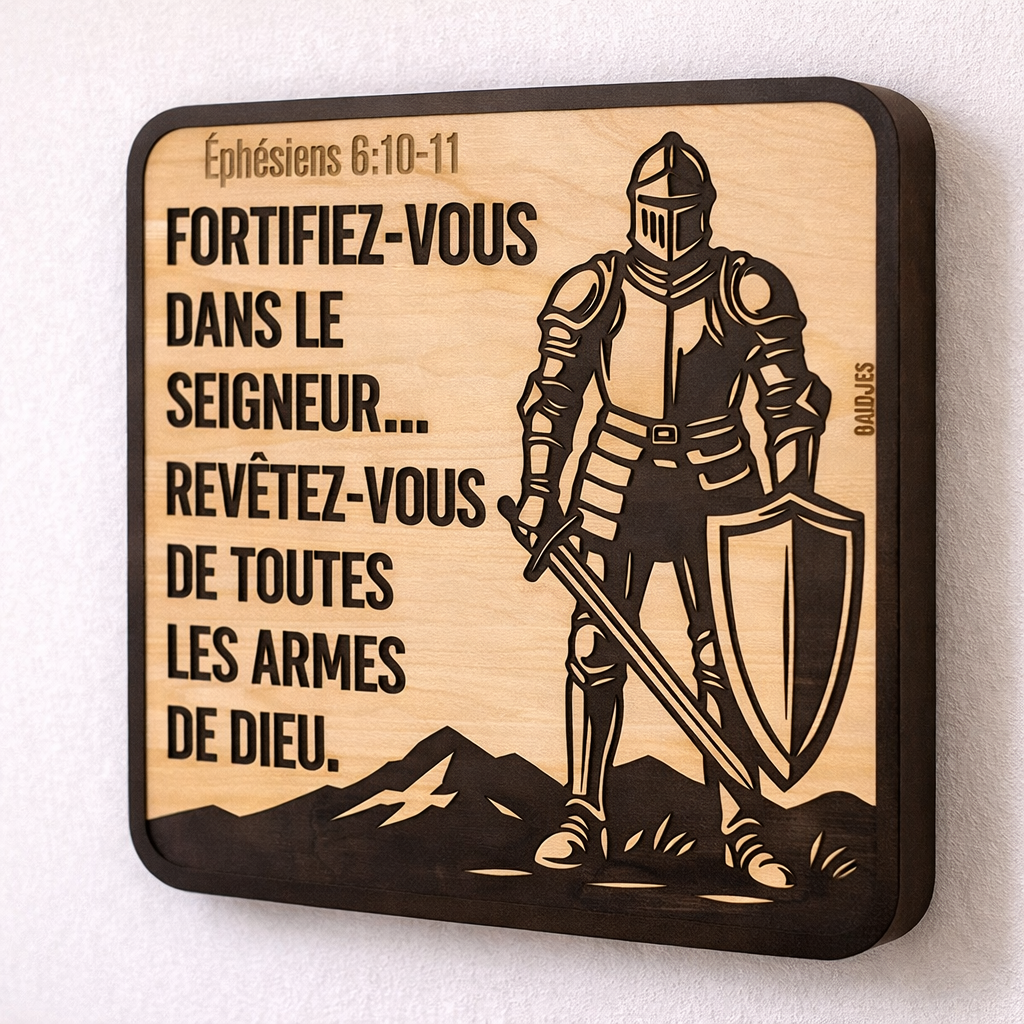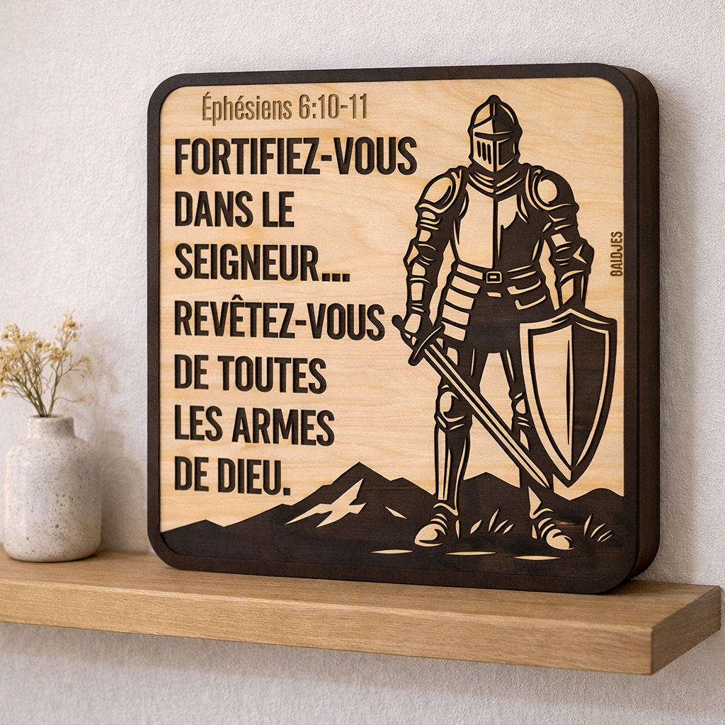 A droite, un chevalier se dresse, son armure finement ciselée. Il ne représente pas une bataille lointaine, mais ce combat intérieur que nous menons tous : les doutes à surmonter, la persévérance à cultiver, cette petite flamme de foi à protéger des vents contraires. À ses côtés, les mots d’Éphésiens 6:10-11 résonnent comme un murmure familier et fort.