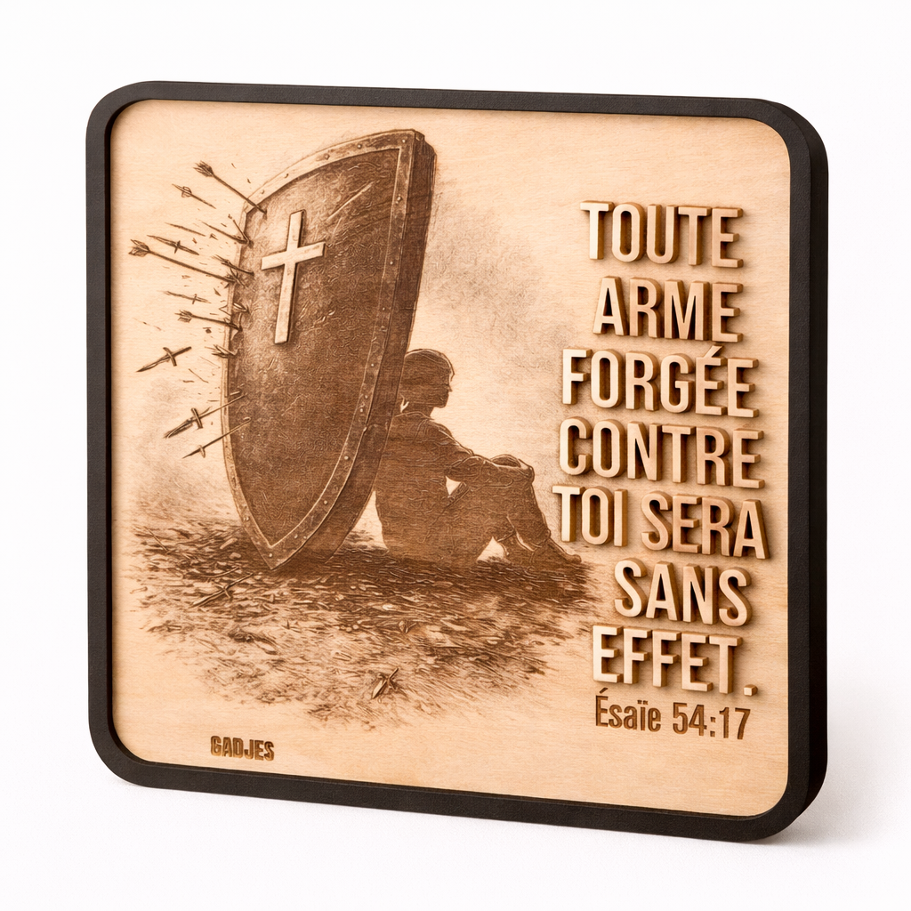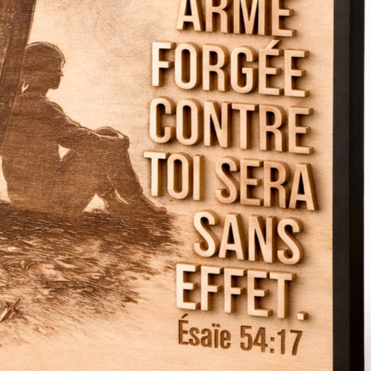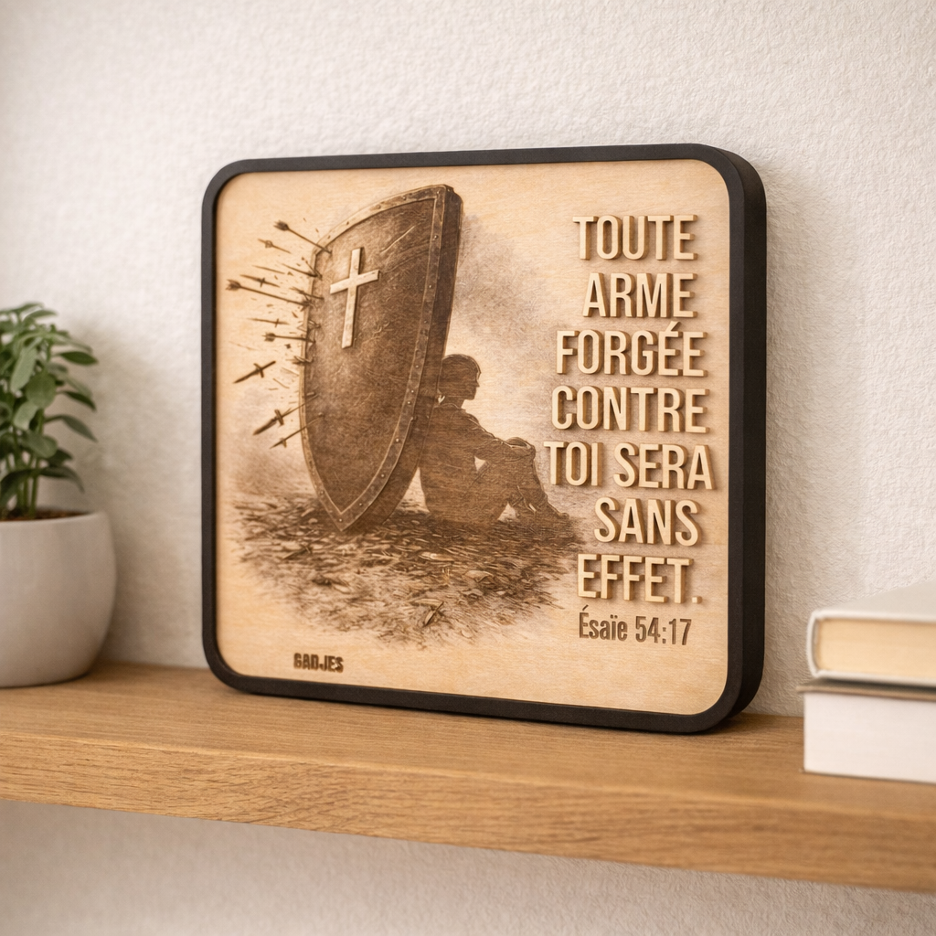 Imaginez accrocher dans votre salon un rappel tangible de cette promesse qui traverse les siècles : « Toute arme forgée contre toi sera sans effet. » C’est exactement ce que propose ce tableau mural, sculpté dans du bois naturel au grain chaleureux.