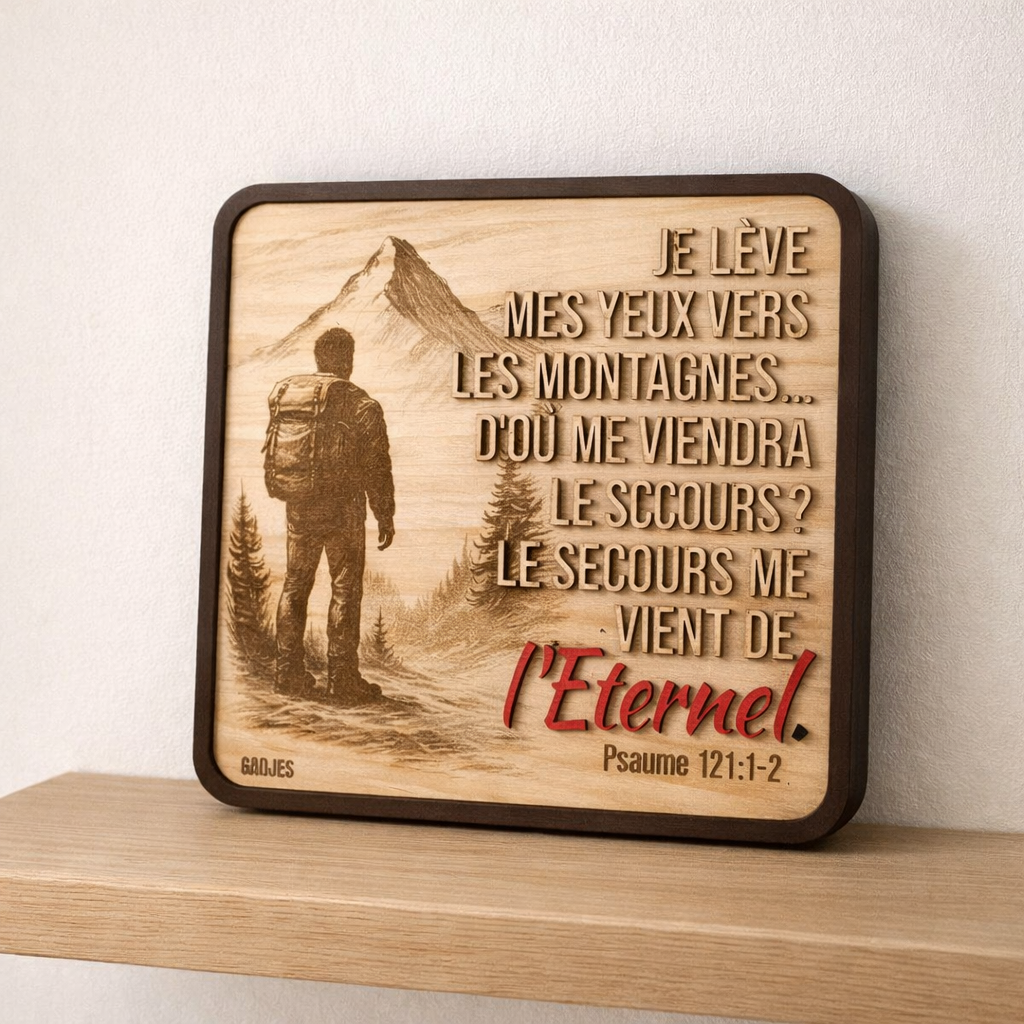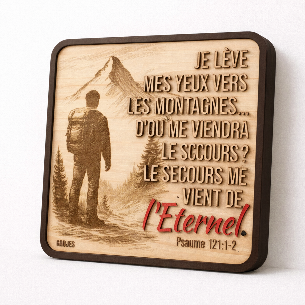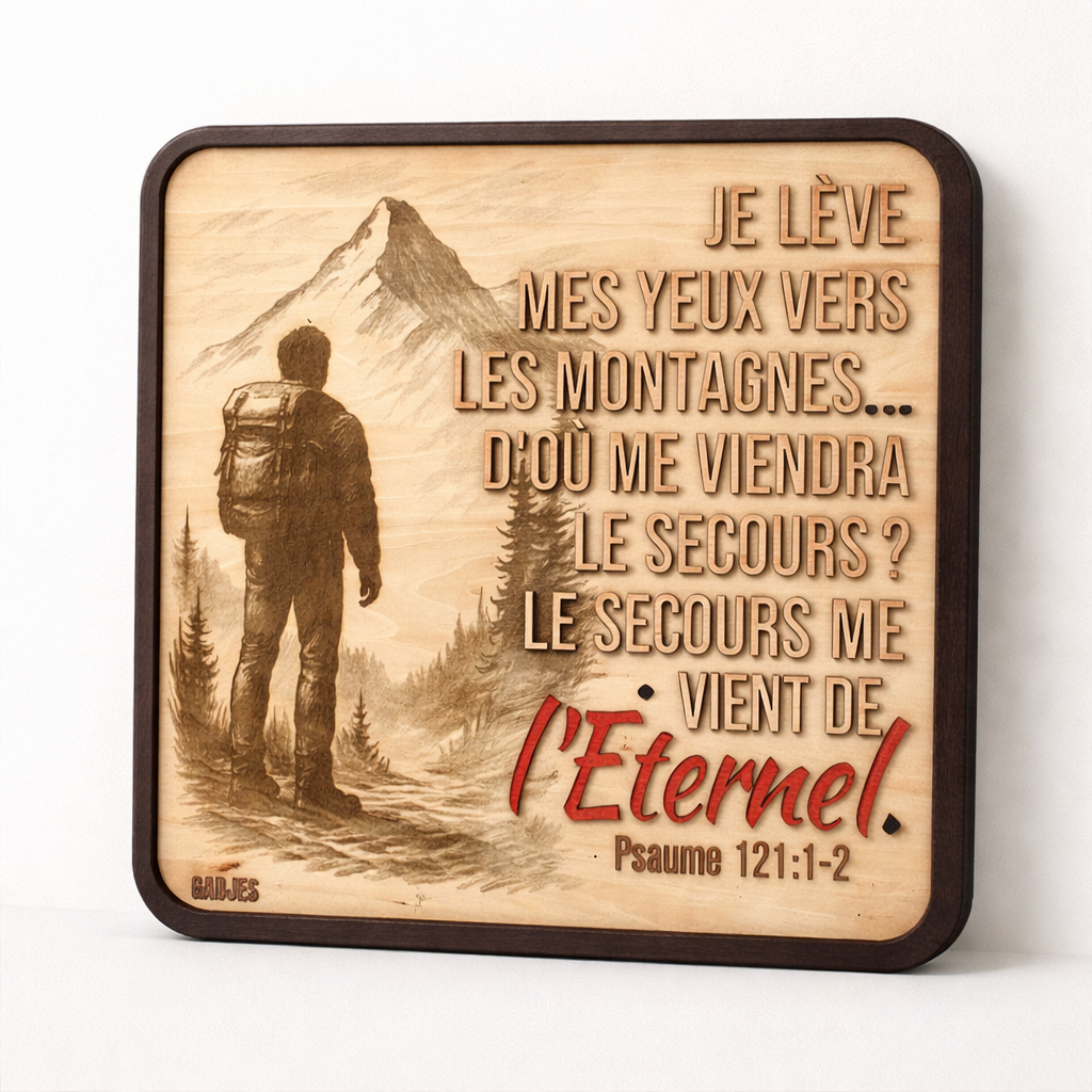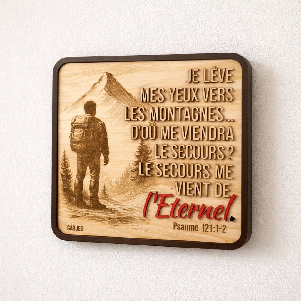 La gravure laser y dessine une silhouette humble face à l’immensité des sommets. On y sent tout à la fois le chemin à parcourir, l’attente, et cette confiance fragile qui s’accroche. Et là, au cœur du texte, le mot « l’Éternel » se détache en un rouge discret mais franc, comme un rappel doux de l’essentiel, sans perturber la sérénité de l’ensemble.