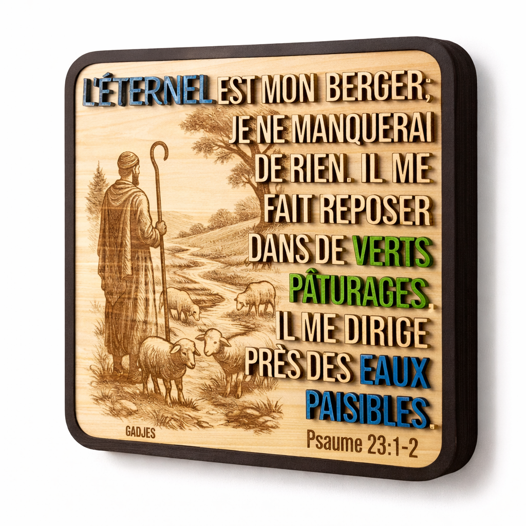 Imaginez accrocher un peu de sérénité sur votre mur. Ce tableau, taillé dans du bois naturel, porte les premiers mots réconfortants du Psaume 23, comme une promesse murmurée à l’oreille : « L’Éternel est mon berger, je ne manquerai de rien. Il me fait reposer dans de verts pâturages, il me dirige près des eaux paisibles. »