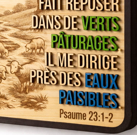 Regardez de plus près : la gravure a fait naître, avec une délicatesse incroyable, la silhouette d’un berger veillant sur son troupeau. Cette scène intemporelle, symbole de protection et de paix, semble presque prendre vie sous vos yeux. Pour guider votre regard et toucher votre cœur, les mots clés se détachent en douceur grâce à des touches de couleur subtiles, ajoutant de la profondeur au message sans jamais alourdir l’ensemble. Le résultat est d’une élégance sobre, parfaitement équilibrée.