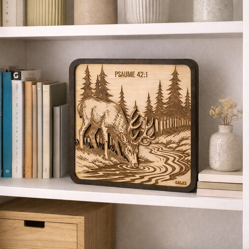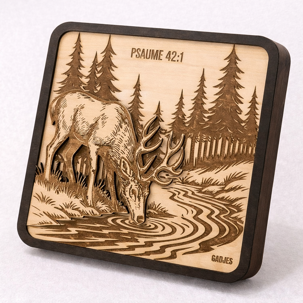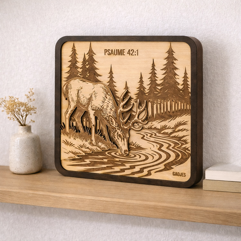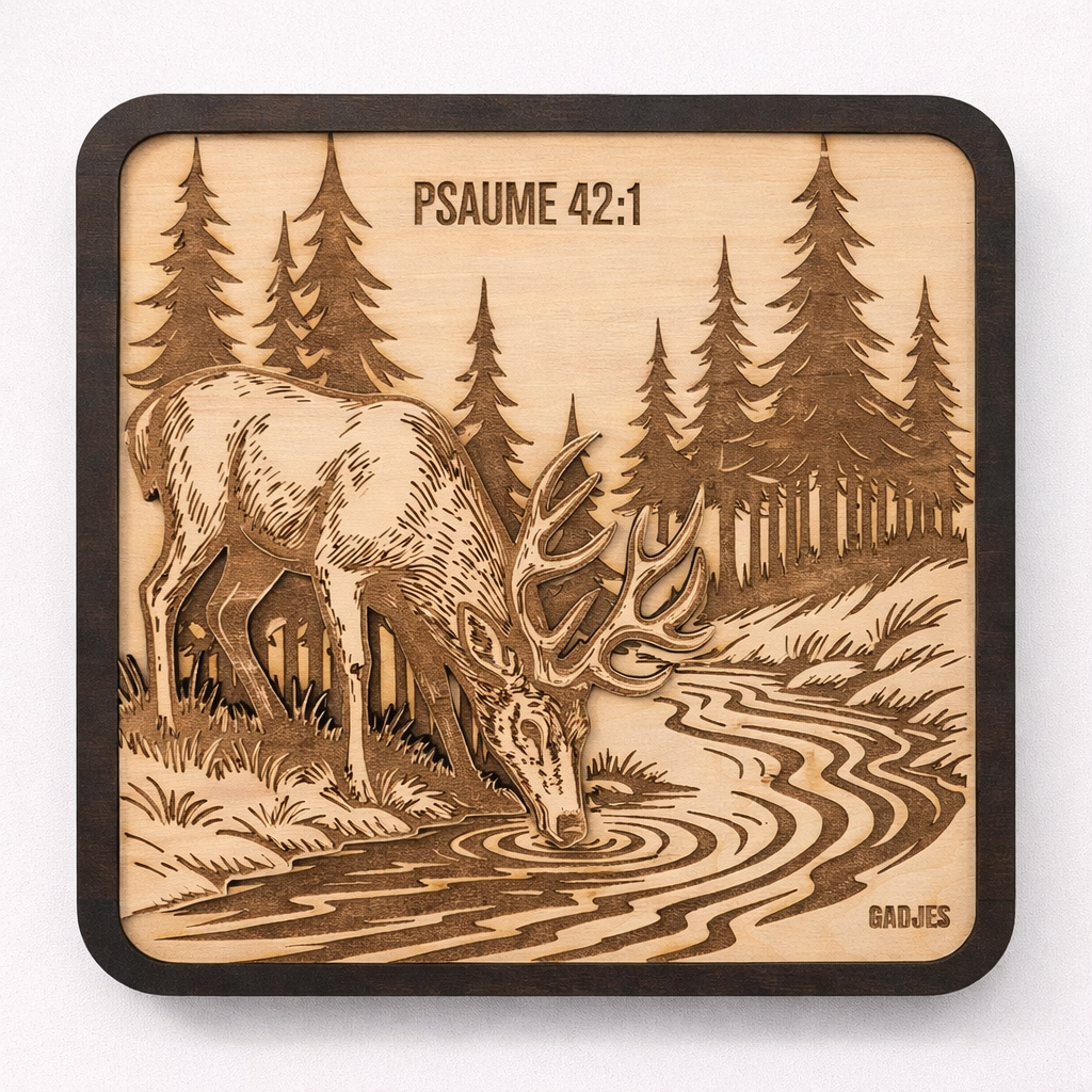 Imaginez un cerf, penché au bord d’un ruisseau tranquille, capturé dans la douceur du bois. Cette gravure s’inspire d’une image puissante : celle du Psaume, où l’âme assoiffée cherche Dieu comme le cerf cherche l’eau vive. Ce n’est pas qu’une simple décoration ; c’est un rappel silencieux de ce désir profond qui nous habite tous, à un moment ou à un autre : le besoin de se reconnecter, de trouver un peu de paix et de présence.