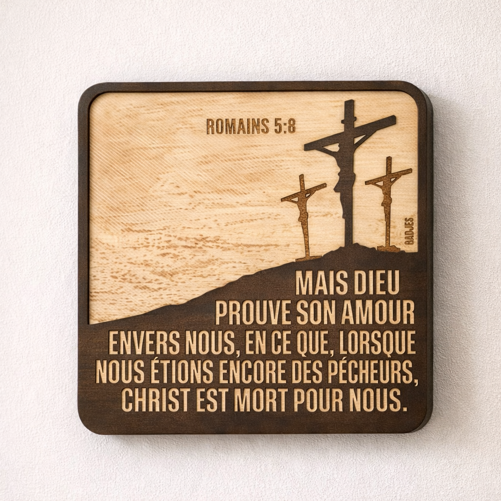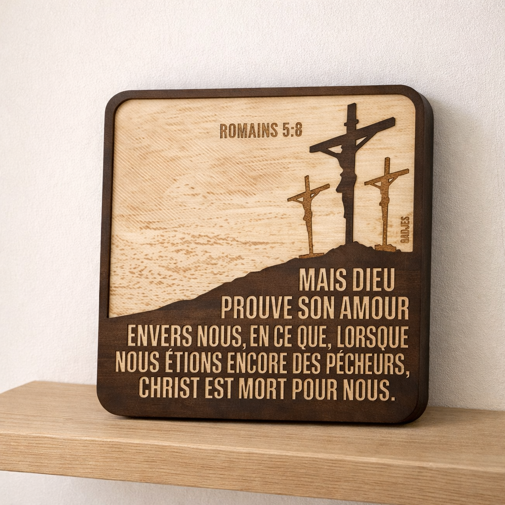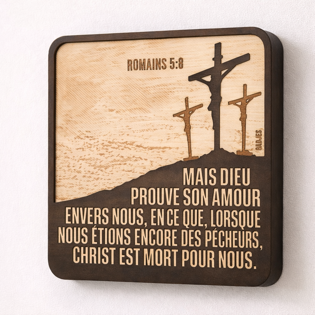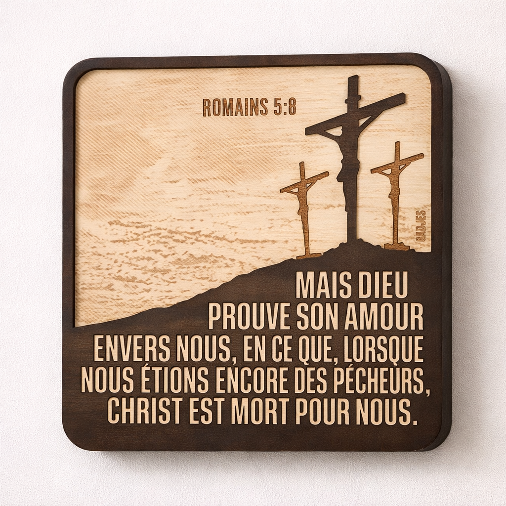 Décoration artisanale en bois – « Mais Dieu prouve son amour envers nous, en ce que, lorsque nous étions encore des pécheurs, Christ est mort pour nous. » (Romains 5:8)